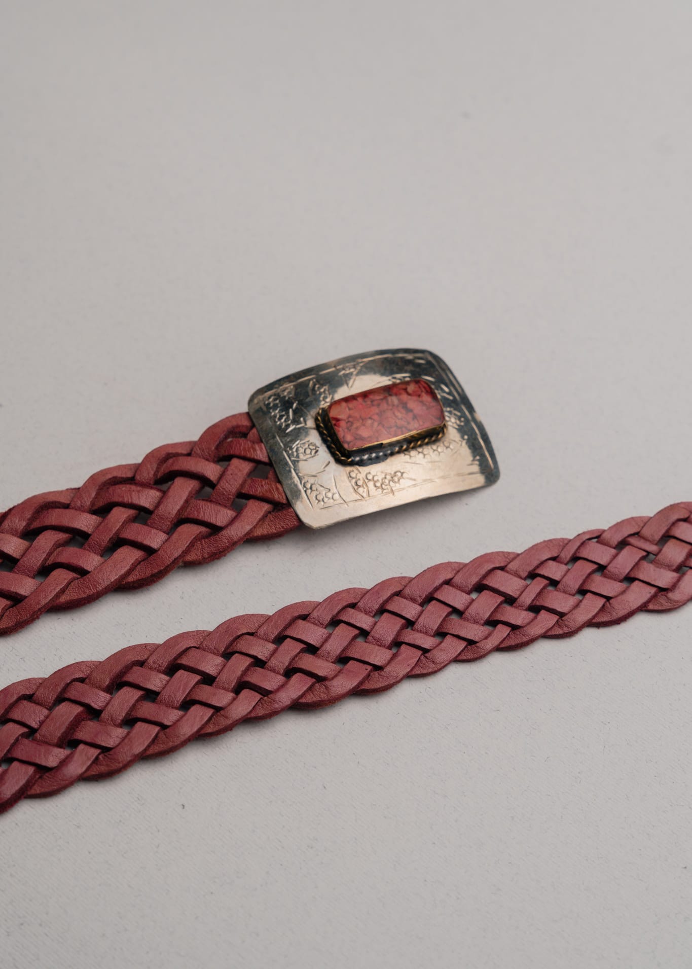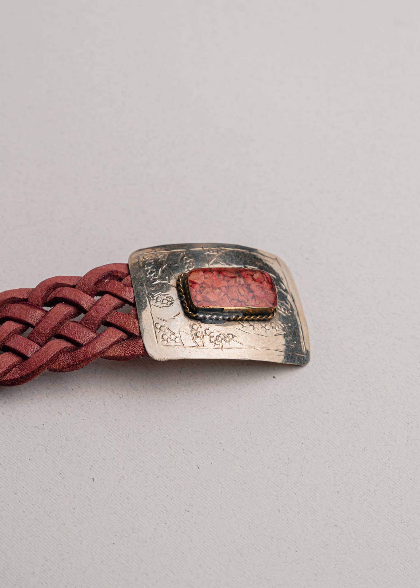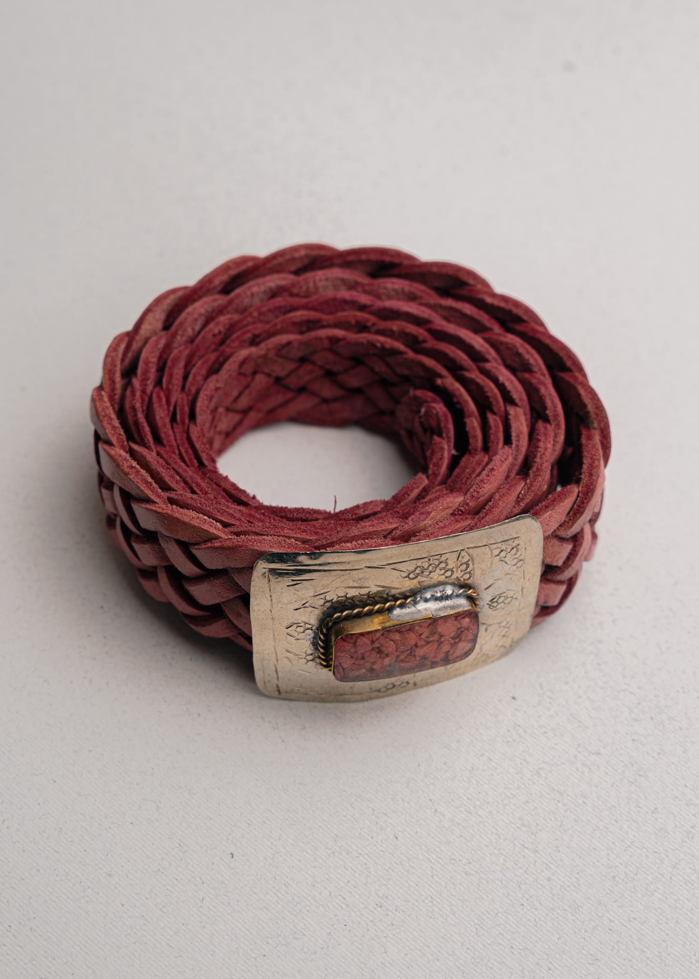 Este cinturón artesanal está elaborado en piel auténtica trenzada a mano, suave y resistente. Su diseño único se completa con una hebilla de alpaca trabajada también a mano, que incluye piedras que aportan un toque especial y elegante.