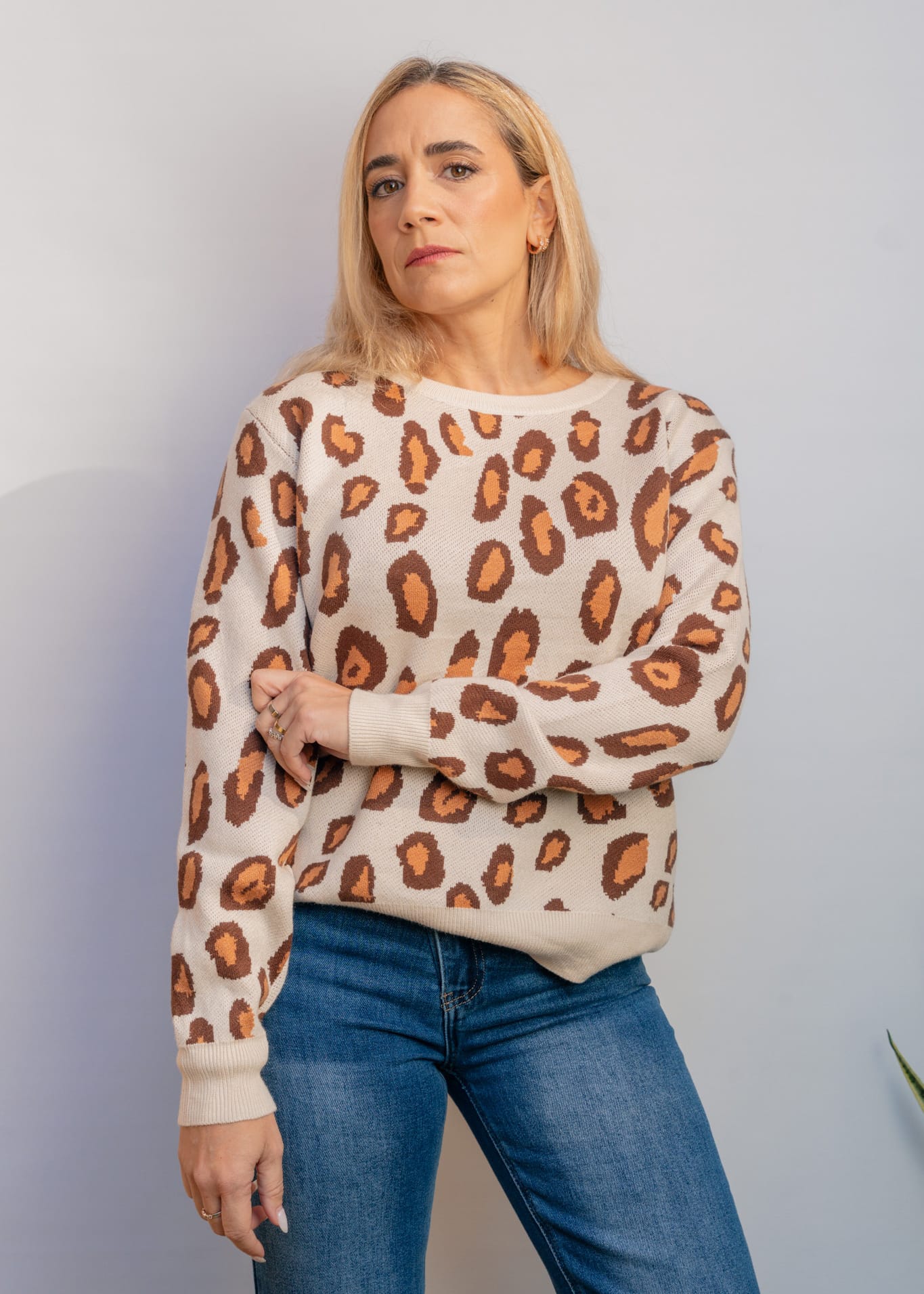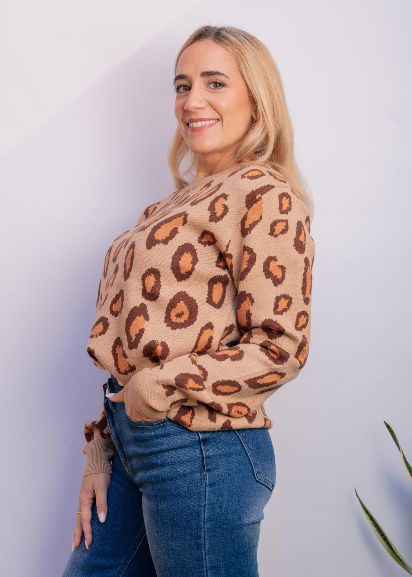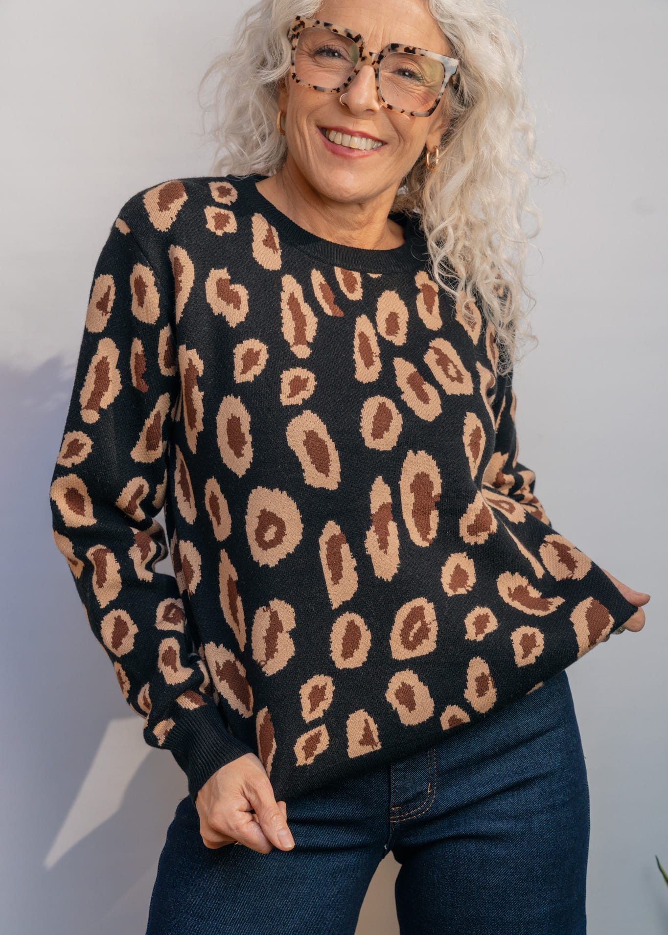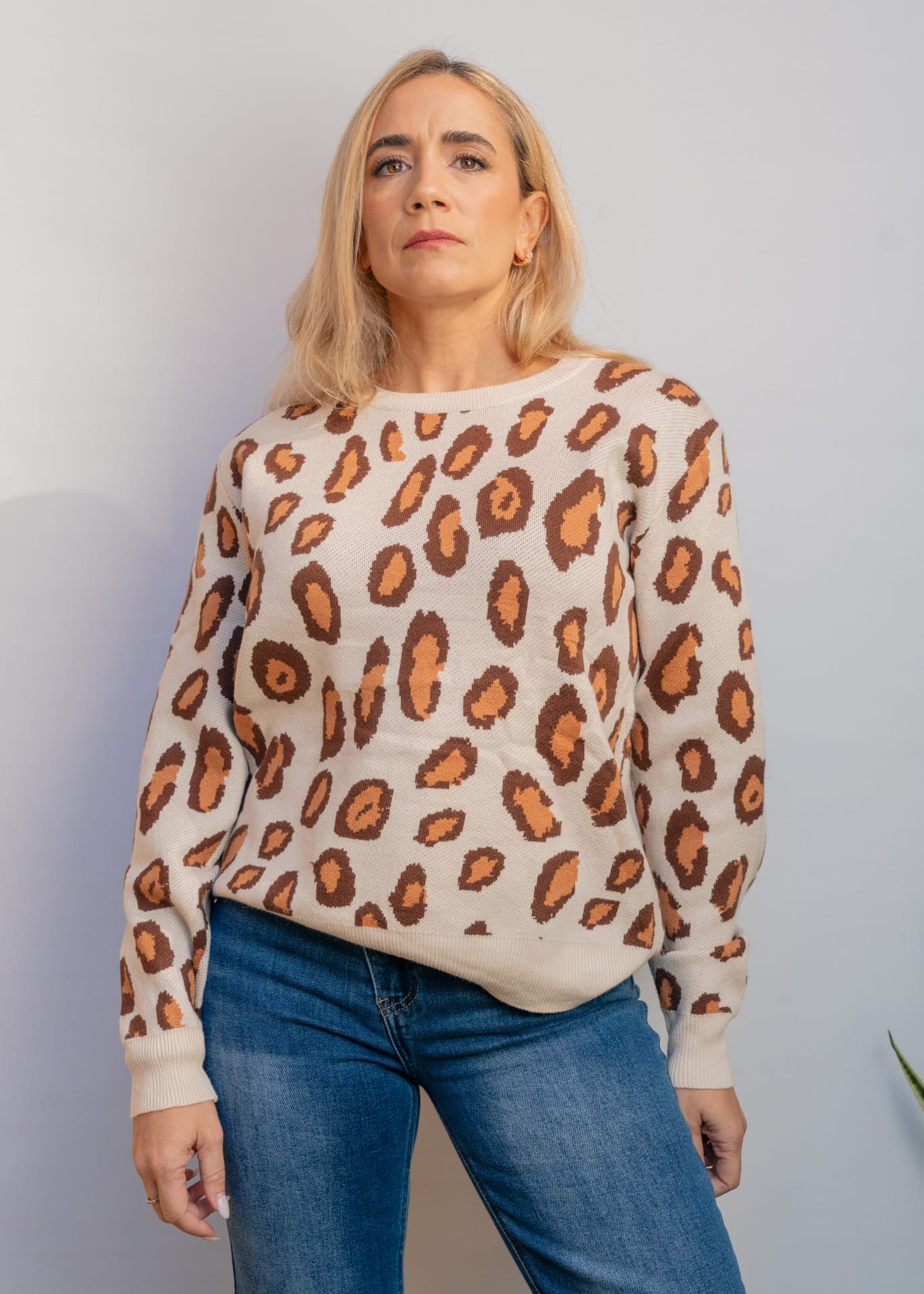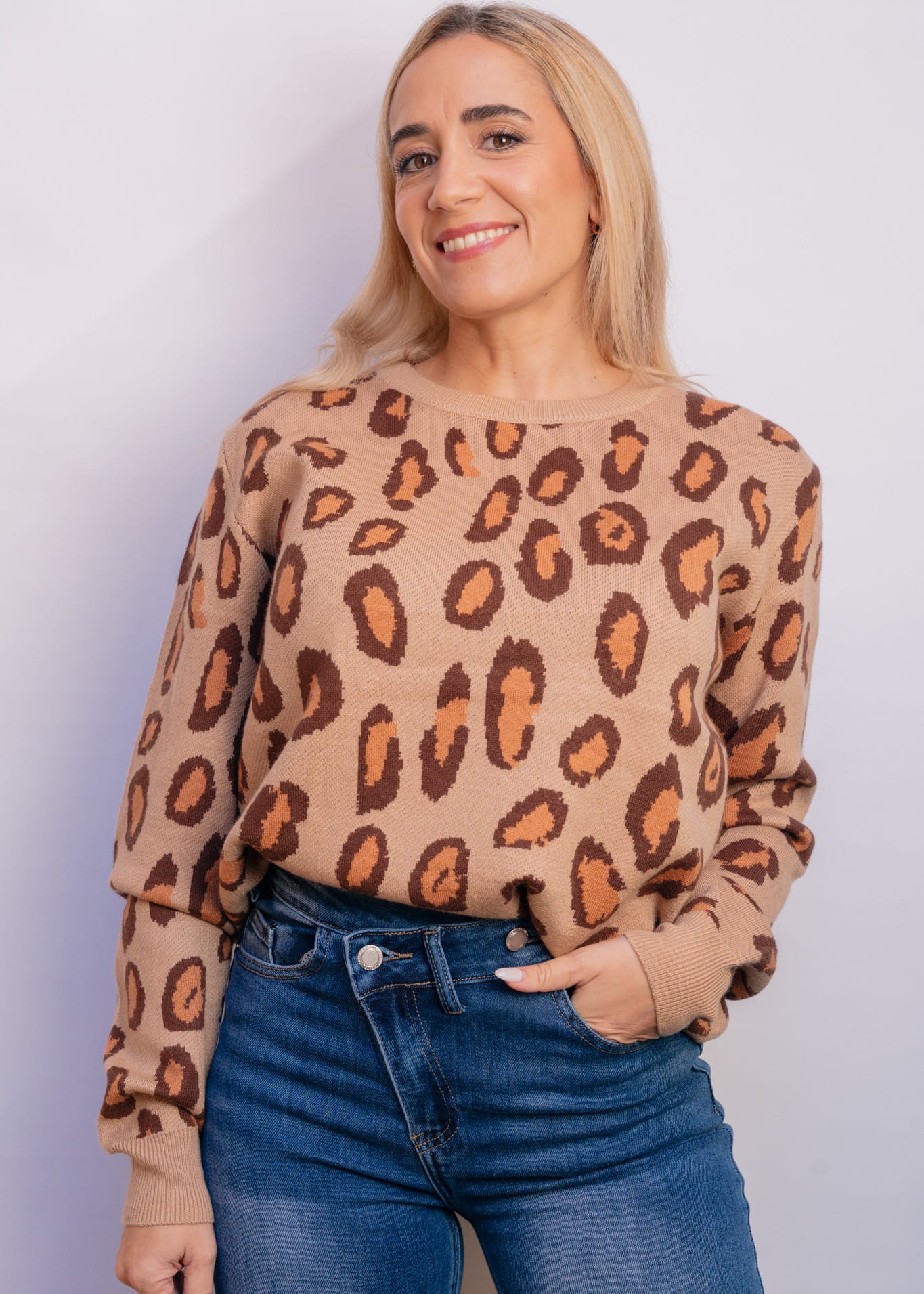Un jersey suave, moderno y lleno de estilo. Confeccionado en un punto cálido pero ligero, este modelo de talla única se adapta con comodidad a distintas siluetas. Presenta un estampado animal print disponible en tres combinaciones de tonos tierra, que aportan un aire natural y elegante. Es muy suave al tacto, no pica y resulta ideal para los días de invierno. Perfecto para combinar con jeans, faldas o pantalones amplios.